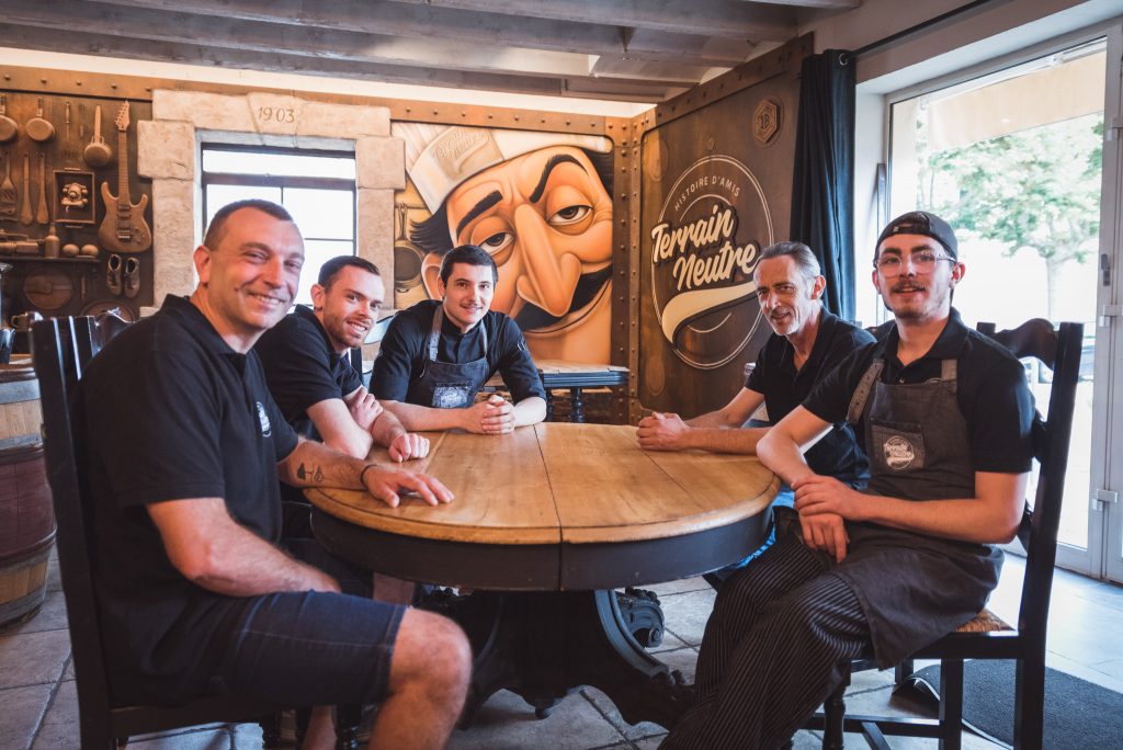 Terrain Neutre, c’est avant tout une belle histoire d’amitié, née au cœur du village. Tom et Martin se sont rencontrés pendant leurs études dans le secteur de la restauration. Aujourd’hui, ils concrétisent leur rêve en s’associant à Xavier et Bruno, deux amis de longue date. À cette fine équipe est venu s’ajouter Maxime : il seconde désormais Martin en cuisine. Ce projet prend forme autour de valeurs communes : une passion pour la cuisine traditionnelle, préparée avec soin à partir de produits frais et bruts soigneusement sélectionnés, ainsi qu’une ambiance conviviale et épicurienne, où l’on prend plaisir à partager de bons moments.