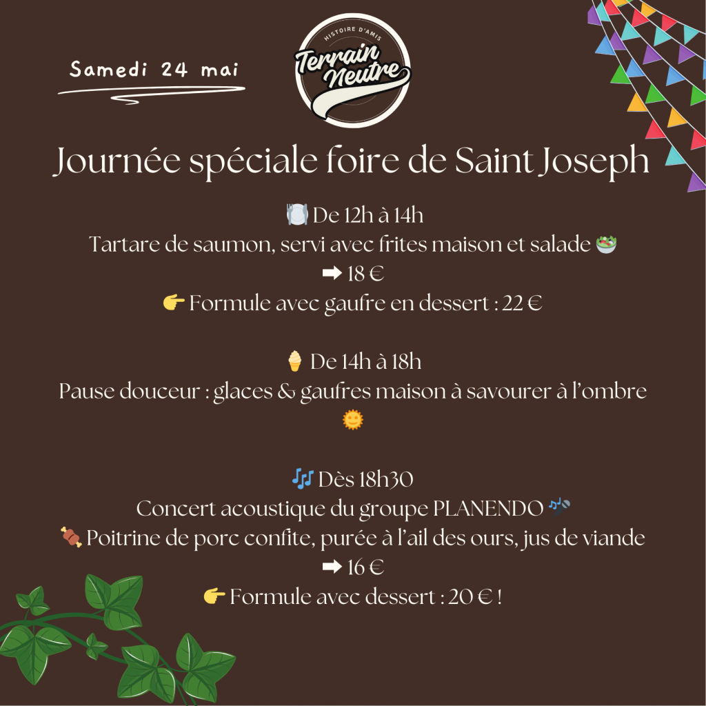 #FoireSaintJo #TerrainNeutre #CuisineMaison #ConcertAcoustique #SaintJoseph #PlancheApéro #TartareDeSaumon #AmbianceBonEnfant #SortieLocale #Piétonnisation